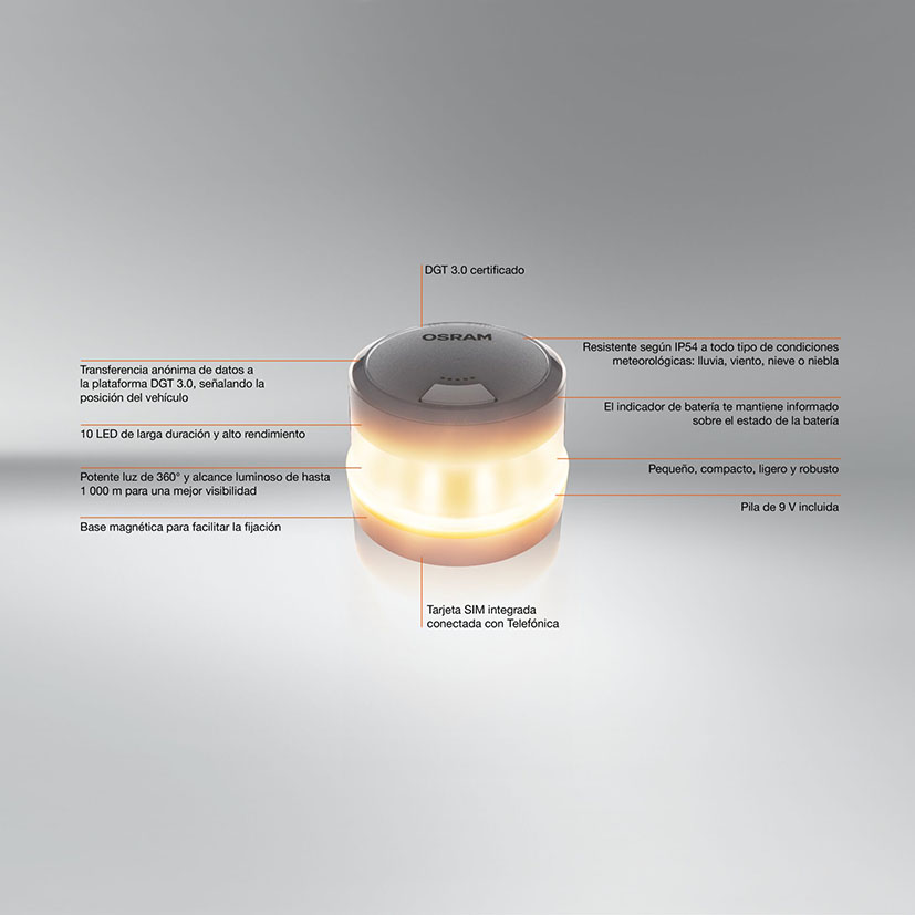 Esta baliza geolocalizable OSRAM está certificada por la DGT 3.0 e incluye 10 LEDs de alto rendimiento. Cuenta con base magnética, resistencia IP54 y una luz de 360°. Su SIM integrada permite el envío anónimo de ubicación a la plataforma oficial. Funciona con pila de 9 V incluida. Ideal para emergencias en carretera.