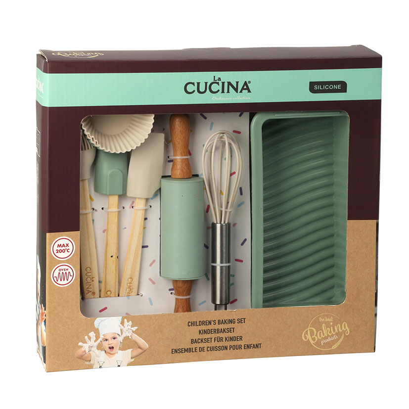 Este completo set de repostería infantil incluye espátulas, rodillo, moldes y batidor, todos fabricados en silicona resistente hasta 200 °C. Perfecto para introducir a los más pequeños en el mundo de la cocina de forma segura y divertida. Ideal para hornear cupcakes, galletas o pan con ayuda de los padres. Presentado en un estuche colorido y listo para regalar.